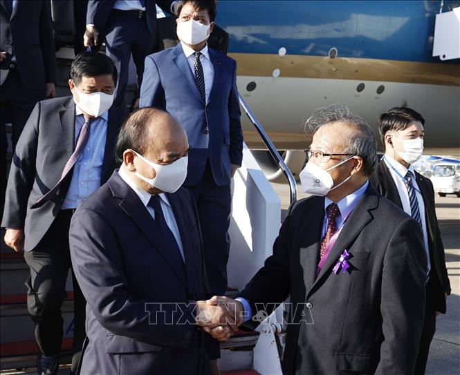 Đại sứ Việt Nam tại Nhật Bản Vũ Hồng Nam đón Chủ tịch nước Nguyễn Xuân Phúc tại sân bay quốc tế Haneda, Tokyo, Nhật Bản. Ảnh: TTXVN |
