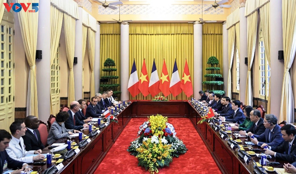 Sau lễ đón, Chủ tịch nước Lương Cường và Tổng thống Pháp Emmanuel Macron tiến hành hội đàm, chứng kiến lễ ký kết, trao các văn kiện hợp tác song phương và gặp gỡ báo chí.