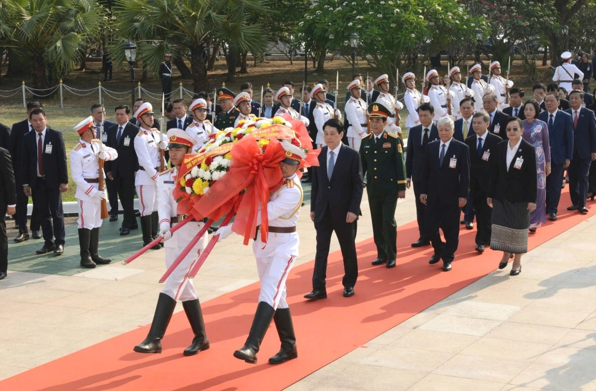 Sáng cùng ngày, Chủ tịch nước Lương Cường đến đặt vòng hoa tại Đài tưởng niệm các anh hùng liệt sĩ Lào ở thủ đô Vientiane.