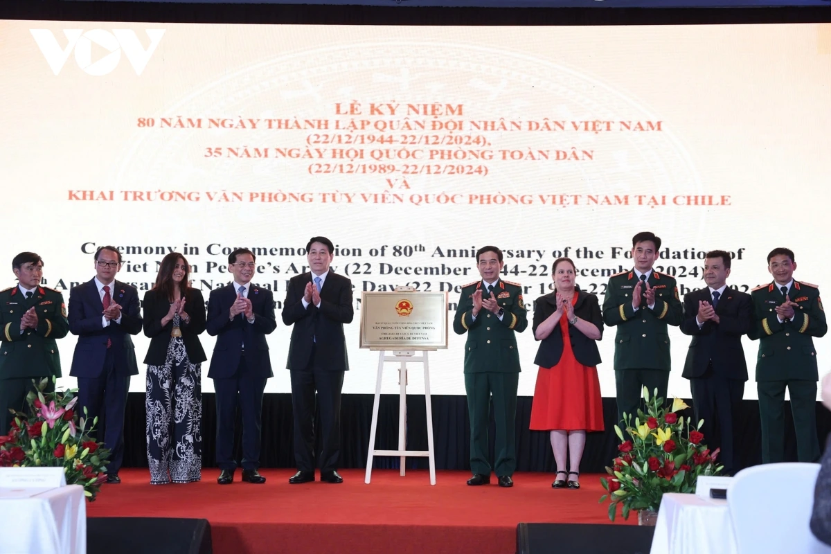 (VOV5) - Tối qua (11/11, theo giờ địa phương), tại thủ đô Santiago de Chile, Bộ Quốc phòng Việt Nam đã tổ chức lễ kỷ niệm 80 năm ngày thành lập Quân đội nhân dân Việt Nam (22/12/1944 – 22/12/2024), 35 năm ngày hội Quốc phòng toàn dân (22/12/1989 – 22/12/2024) và khai trương Văn phòng Tuỳ viên Quốc phòng Việt Nam tại Chile. Chủ tịch nước Lương Cường và đoàn đại biểu cấp cao Việt Nam đang ở thăm chính thức Chile, tham dự buổi lễ.