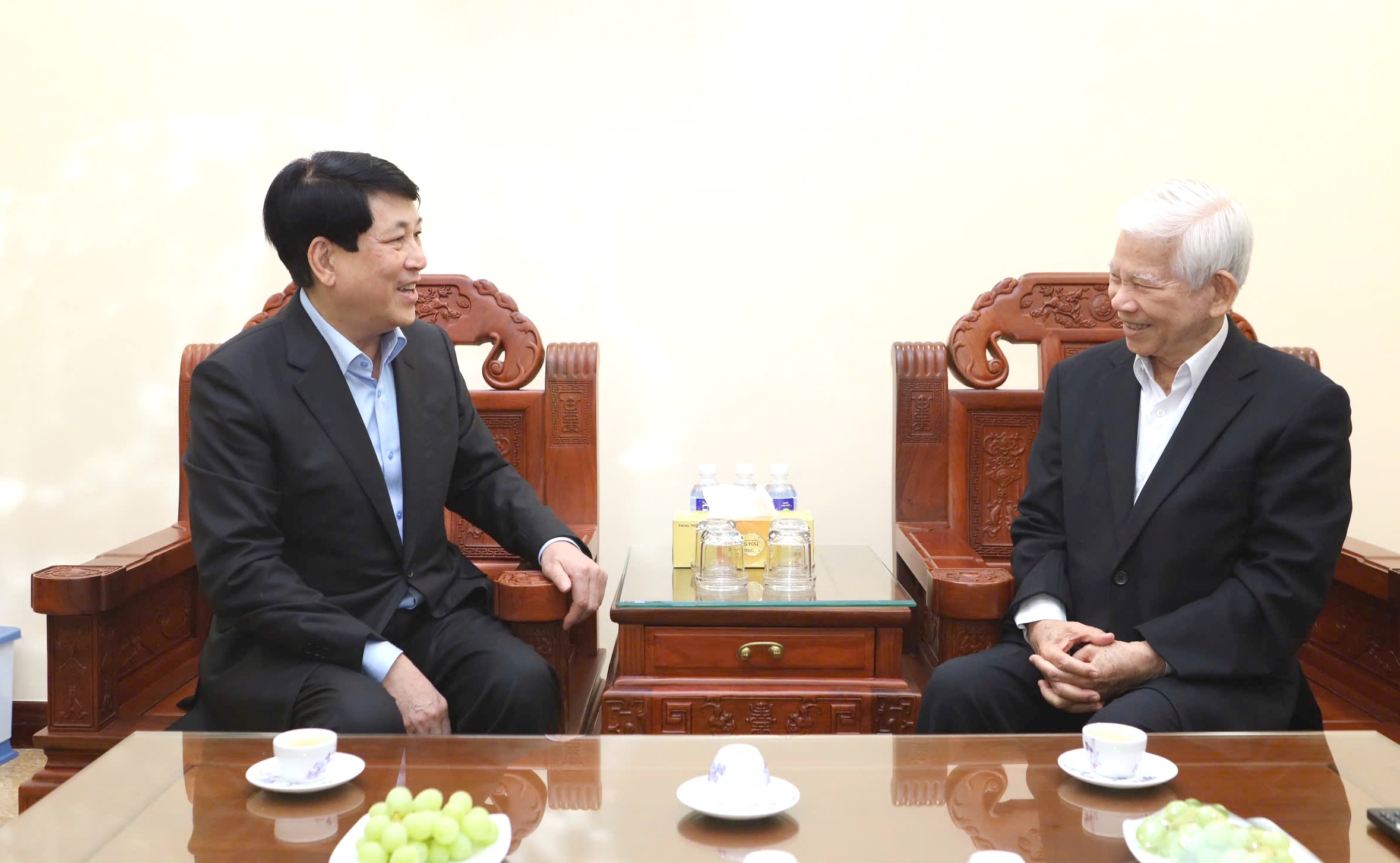 Chủ tịch nước Lương Cường thăm hỏi sức khỏe, cuộc sống gia đình của hai nguyên Chủ tịch nước; bày tỏ trân trọng những đóng góp của hai nguyên Chủ tịch nước đối với sự nghiệp cách mạng của Đảng, nâng cao vị thế, uy tín đất nước và củng cố khối đại đoàn kết toàn dân tộc.