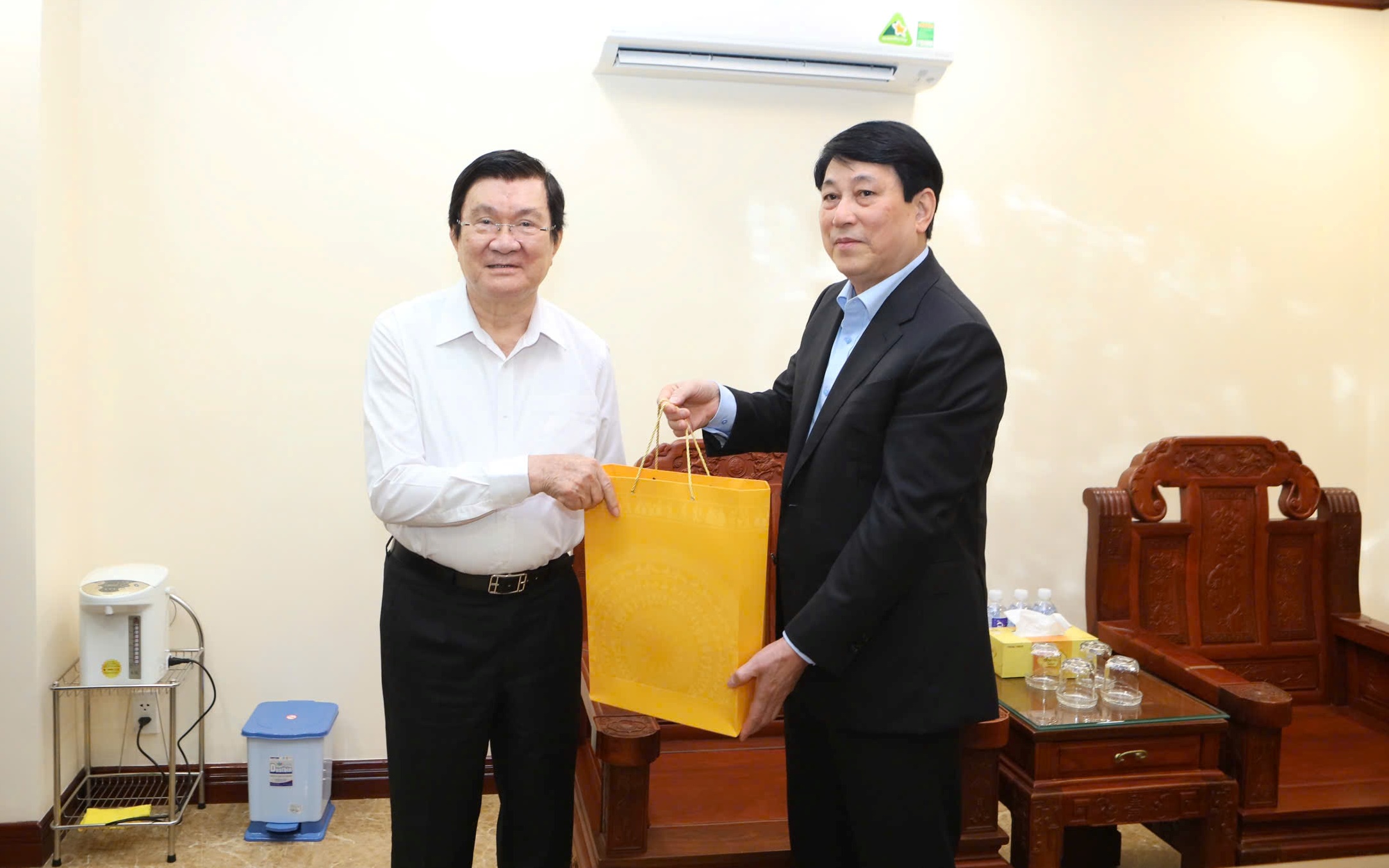 Chủ tịch nước Lương Cường tặng quà, chúc Tết nguyên Chủ tịch nước Trương Tấn Sang. Ảnh: Việt Cường/VOV |