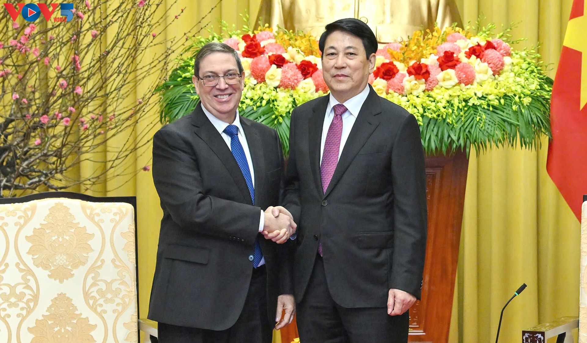 Chủ tịch nước Lương Cường và Đặc phái viên Đảng Cộng sản Cuba, Nhà nước Cộng hòa Cuba, Ủy viên Bộ Chính trị, Bộ trưởng Bộ Ngoại giao Bruno Rodríguez Parrilla. Ảnh: Việt Cường/VOV |
