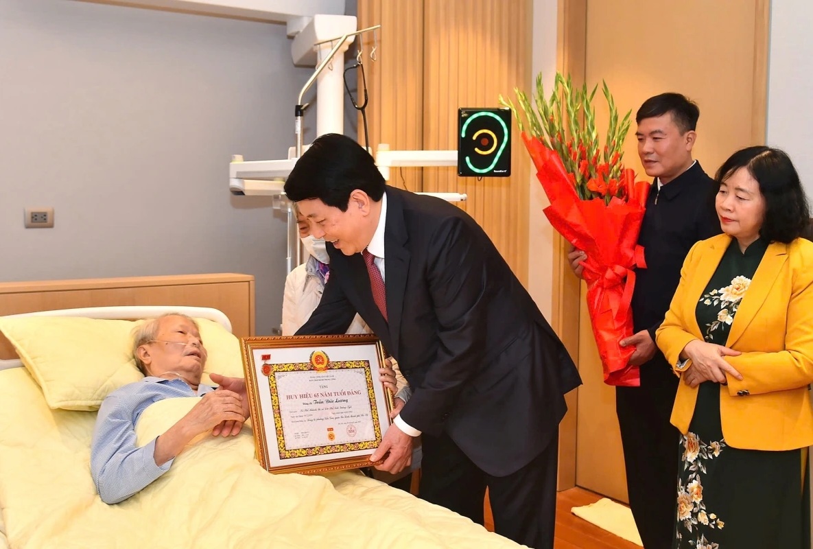 Chủ tịch nước Lương Cường trao Huy hiệu 65 năm tuổi đảng tặng nguyên Chủ tịch nước Trần Đức Lương. Ảnh: VOV