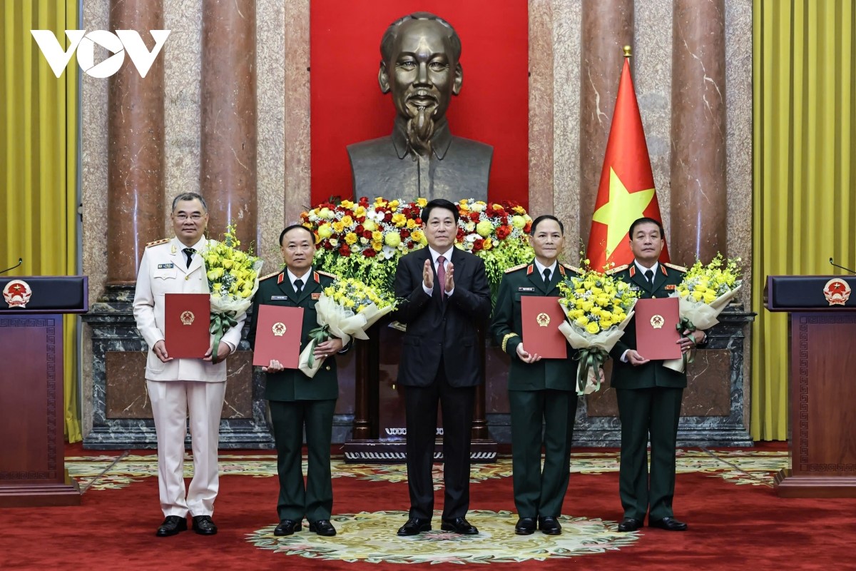 Chủ tịch nước Lương Cường trao quyết định thăng quân hàm, cấp bậc hàm Thượng tướng cho sỹ quan cấp cao Quân đội và Công an. Ảnh: Việt Cường/VOV |