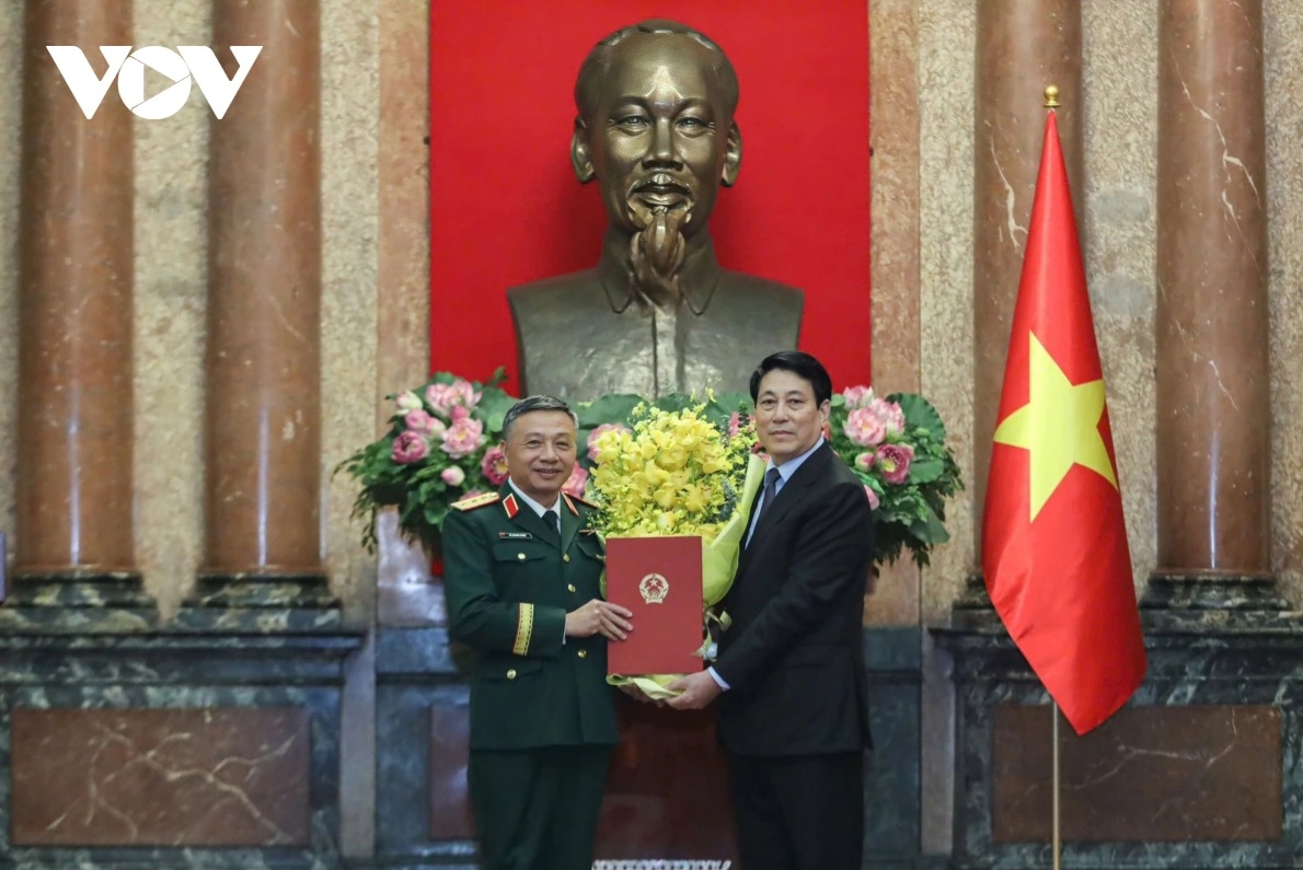 Chủ tịch nước Lương Cường trao quyết định cho ông Lê Quang Minh. Ảnh: VOV |