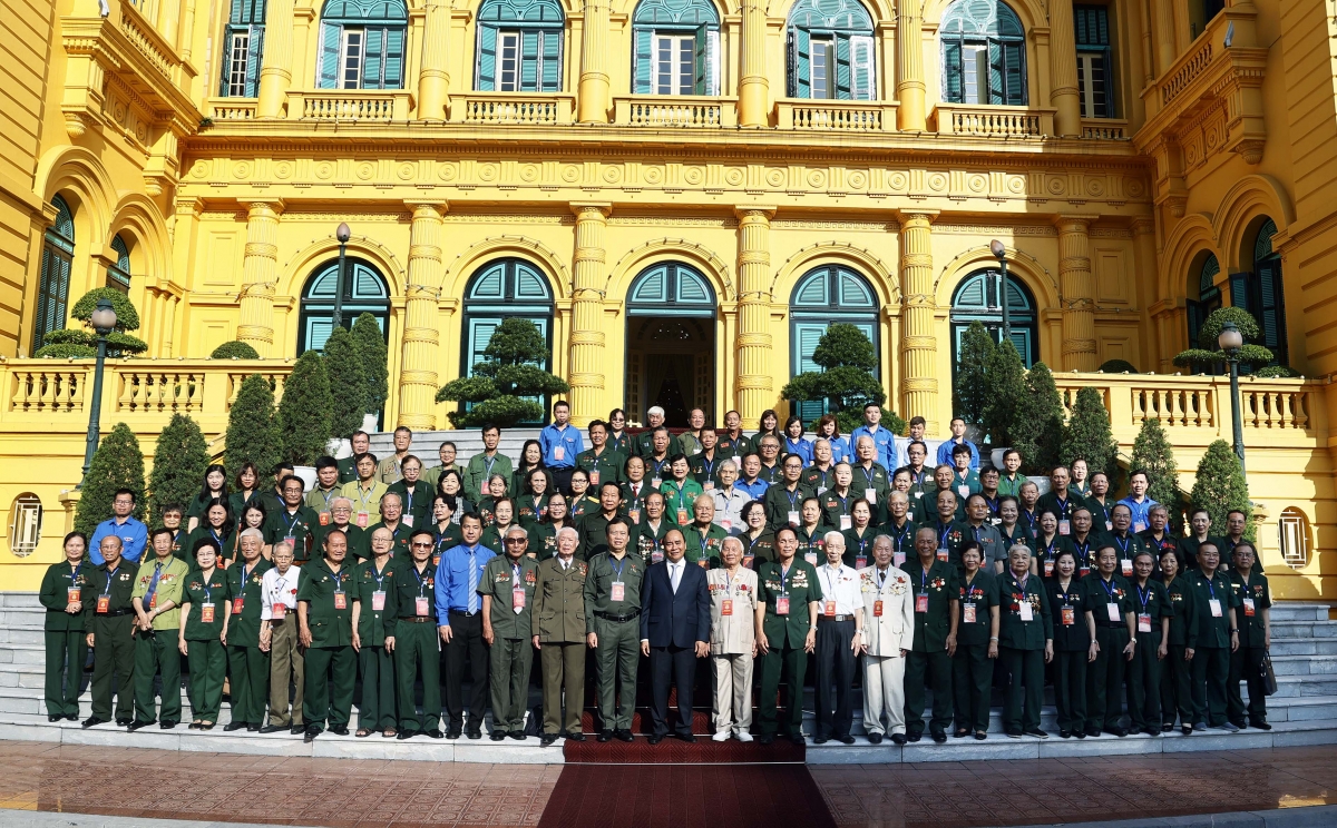 Chủ tịch nước Nguyễn Xuân Phúc gặp mặt 100 đại biểu của Hội Cựu Thanh niên xung phong Việt Nam. Ảnh: VOV |
