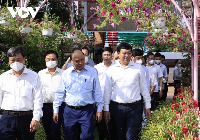 Chủ tịch nước đến thăm Hội quán cùng nhau làm Du lịch tại Làng hoa Sa Đéc - Thành phố Sa Đéc, một mô hình kinh tế hợp tác hiệu quả cao của các hộ dân. Ảnh: VOV |