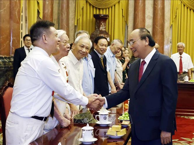 Chủ tịch nước Nguyễn Xuân Phúc gặp mặt Đoàn đại biểu cán bộ từng trực tiếp phục vụ, bảo vệ Chủ tịch Hồ Chí Minh - Ảnh: TTXVN |