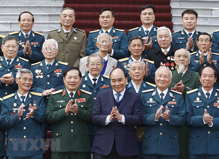 Chiều 20/12, tại Phủ Chủ tịch, Chủ tịch nước Nguyễn Xuân Phúc gặp mặt thân mật Đoàn đại biểu Ban Liên lạc Cựu chiến binh Sư đoàn Phòng không 361. Ảnh: Thống Nhất/ TTXVN |