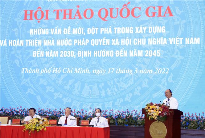 Phát biểu tại Hội thảo, Chủ tịch nước Nguyễn Xuân Phúc nhấn mạnh đến mục tiêu: Phấn đấu đến năm 2045, hoàn thiện cơ bản mô hình Nhà nước pháp quyền XHCN thực sự của Nhân dân, do Nhân dân, vì Nhân dân do Đảng lãnh đạo; lấy phát triển con người làm trung tâm; tôn trọng, bảo đảm, bảo vệ quyền con người, quyền công dân; bảo đảm chủ quyền nhân dân; thượng tôn Hiến pháp và pháp luật; có hệ thống pháp luật đầy đủ, đồng bộ, thống nhất, khả thi, công khai, minh bạch, ổn định, dễ tiếp cận, có hiệu lực cao, đáp ứng yêu cầu hội nhập quốc tế.