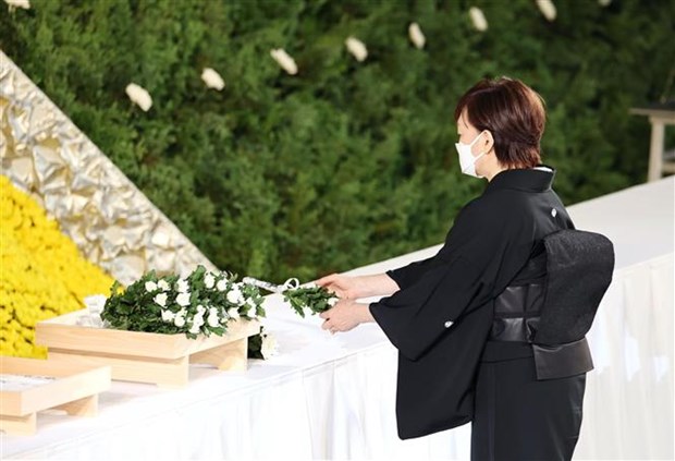 Phu nhân Abe Shinzo đặt hoa tưởng niệm cố Thủ tướng Nhật Bản Abe Shinzo trong Lễ Quốc tang ở Tokyo, ngày 27/9/2022. Ảnh: Kyodo/TTXVN |