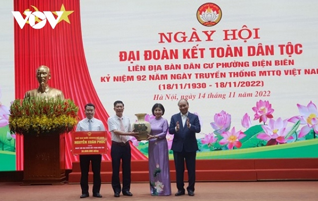 Nhân dịp kỷ niệm 92 năm Ngày truyền thống Mặt trận Tổ quốc Việt Nam (18/11/1930-18/11/2022), tối 14/11, Chủ tịch nước Nguyễn Xuân Phúc dự Ngày hội Đại đoàn kết toàn dân tộc tại phường Điện Biên, quận Ba Đình, Hà Nội.