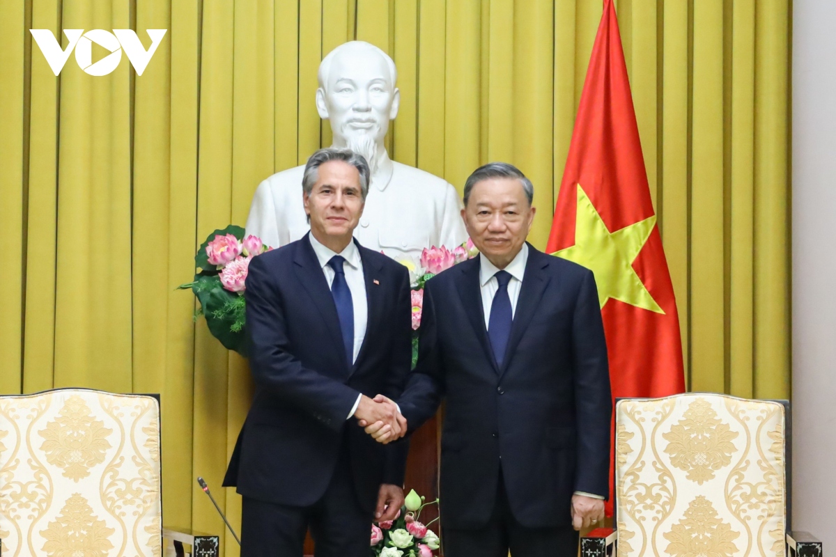 Nhân dịp này, Chủ tịch nước Tô Lâm và Ngoại trưởng Blinken bày tỏ vui mừng trước những tiến triển tích cực của quan hệ hai nước thời gian qua trên tất cả các lĩnh vực từ chính trị - ngoại giao, kinh tế - thương mại - đầu tư, an ninh - quốc phòng, khắc phục hậu quả chiến tranh... Chủ tịch nước Tô Lâm khẳng định Việt Nam coi Hoa Kỳ là đối tác có tầm quan trọng chiến lược hàng đầu của Việt Nam và hoan nghênh Hoa Kỳ tiếp tục cam kết ủng hộ một Việt Nam “mạnh, độc lập, tự cường và thịnh vượng”; mong muốn tiếp tục phối hợp chặt chẽ thực hiện cam kết của Tổng Bí thư Nguyễn Phú Trọng và Tổng thống Biden nhằm đưa khuôn khổ quan hệ mới đi vào chiều sâu, hiệu quả và ổn định.