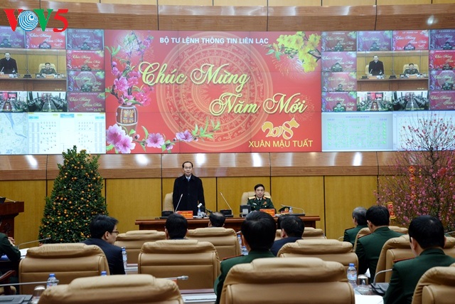 Đến kiểm tra công tác trực ban, trực chiến đấu và chúc Tết cán bộ, chiến sĩ Bộ Tư lệnh Thông tin liên lạc, qua cầu truyền hình tại trụ sở Bộ Tư lệnh Thông tin liên lạc, Chủ tịch nước Trần Đại Quang nói chuyện, chúc Tết cán bộ, chiến sĩ tại 10 đơn vị thuộc Binh chủng Thông tin liên lạc.