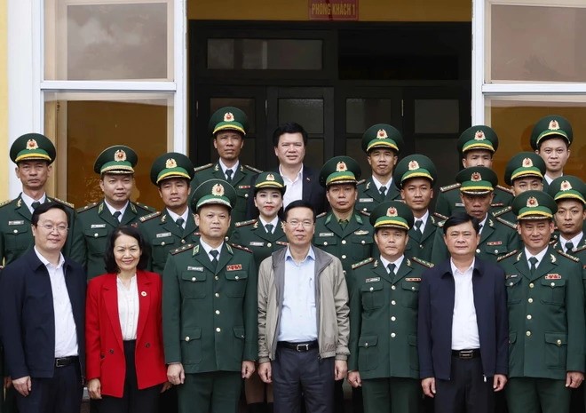 Chủ tịch nước Võ Văn Thưởng với cán bộ, chiến sỹ Đồn Biên phòng Cửa khẩu Thanh Thủy. Ảnh: Thống Nhất/TTXVN