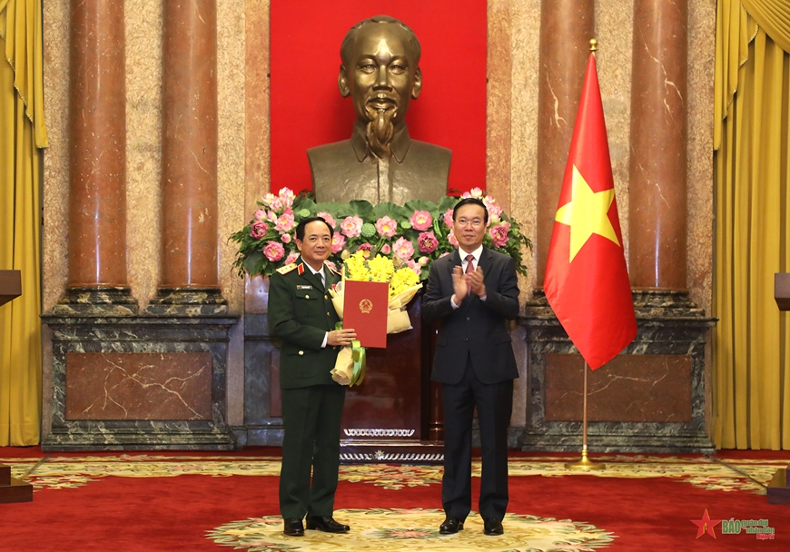 Chủ tịch nước Võ Văn Thưởng trao quyết định thăng quân hàm từ Trung tướng lên Thượng tướng đối với đồng chí Trịnh Văn Quyết. Ảnh: QĐND |