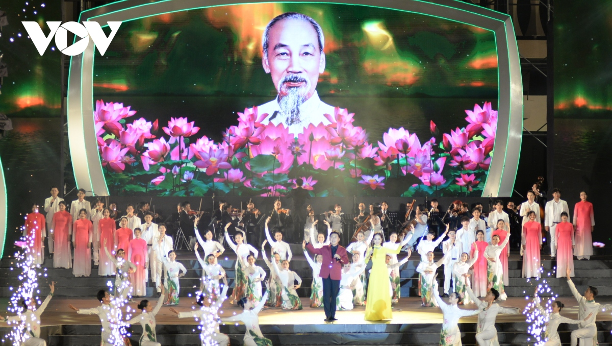 Các tiết mục nghệ thuật được dàn dựng công phu, ca ngợi Đảng, Bác Hồ, ca ngợi đất nước, văn hóa truyền thống, con người Việt Nam. Ảnh: VOV |