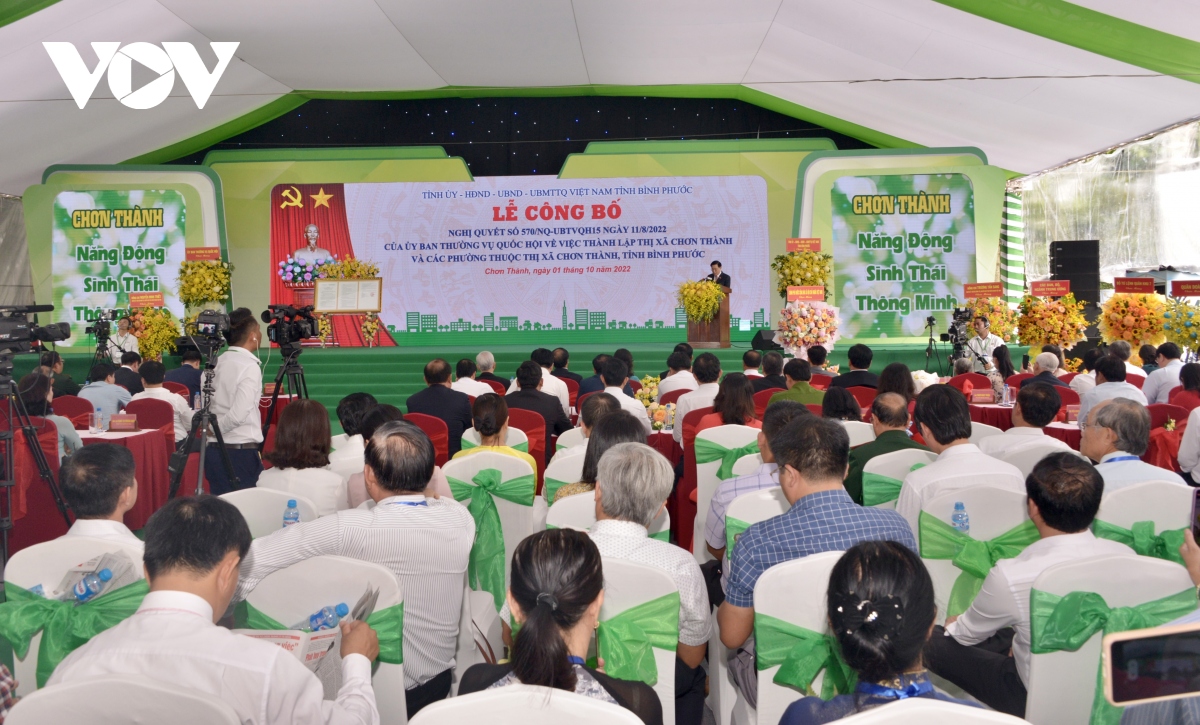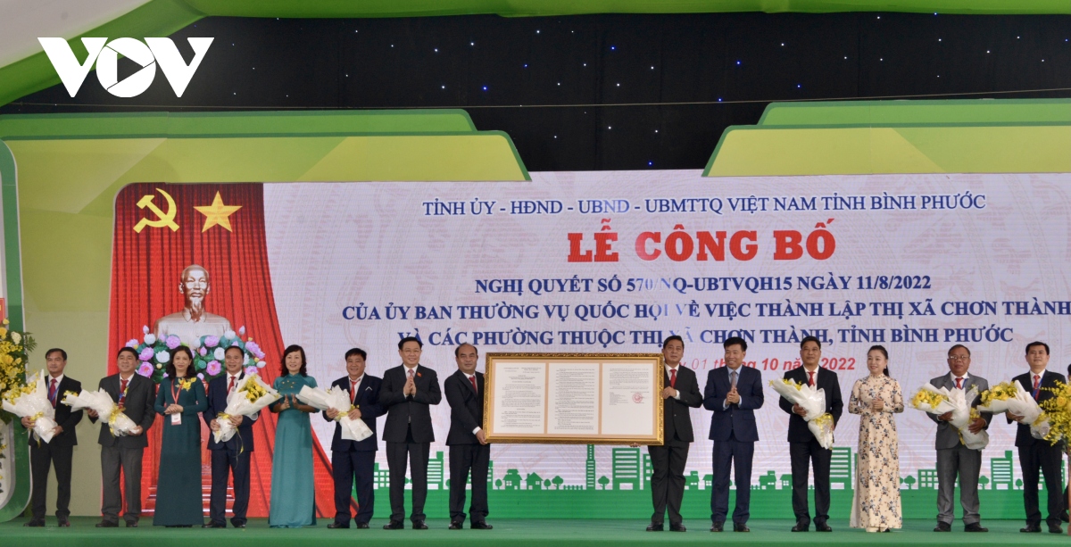 Sáng 1/10, tại thị xã Chơn Thành, tỉnh Bình Phước đã diễn ra Lễ công bố Nghị quyết của Ủy ban Thường vụ của Quốc hội về việc thành lập thị xã Chơn Thành và các phường thuộc thị xã Chơn Thành, tỉnh Bình Phước. Chủ tịch Quốc hội Vương Đình Huệ tham dự lễ công bố.