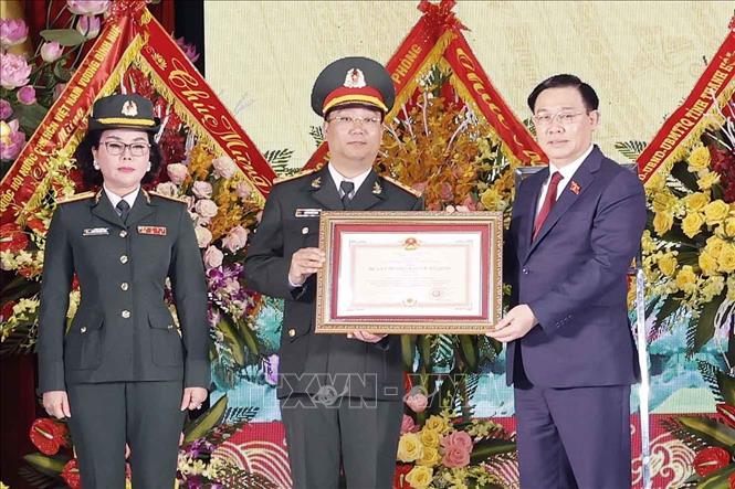 Thay mặt lãnh đạo Đảng, Nhà nước, Chủ tịch Quốc hội Vương Đình Huệ trao Huân chương Bảo vệ Tổ quốc hạng Nhất cho Nhà máy - Ảnh: Doãn Tấn/TTXVN |