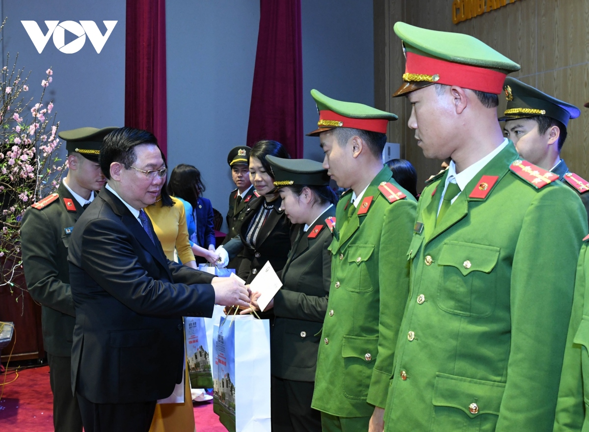Thay mặt Lãnh đạo Đảng, Nhà nước, Quốc hội, Chủ tịch Quốc hội Vương Đình Huệ gửi tới toàn thể cán bộ, chiến sĩ công an tỉnh Nghệ An lời thăm hỏi thân tình và lời chúc mừng năm mới; đồng thời biểu dương những thành tích xuất sắc của tập thể Công an tỉnh Nghệ An.