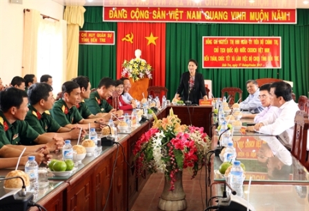 Thăm và tìm hiểu tình hình đời sống, công tác của cán bộ chiến sỹ Bộ Chỉ huy Quân sự tỉnh Bến Tre, Chủ tịch Nguyễn Thị Kim Ngân mong muốn đơn vị sẽ tiếp tục đồng lòng, sát cánh là chỗ dựa tin cậy cùng cấp ủy, chính quyền tỉnh Bến Tre thực hiện thắng lợi các nhiệm vụ phát triển kinh tế xã hội, đảm bảo quốc phòng, an ninh trên địa bàn.