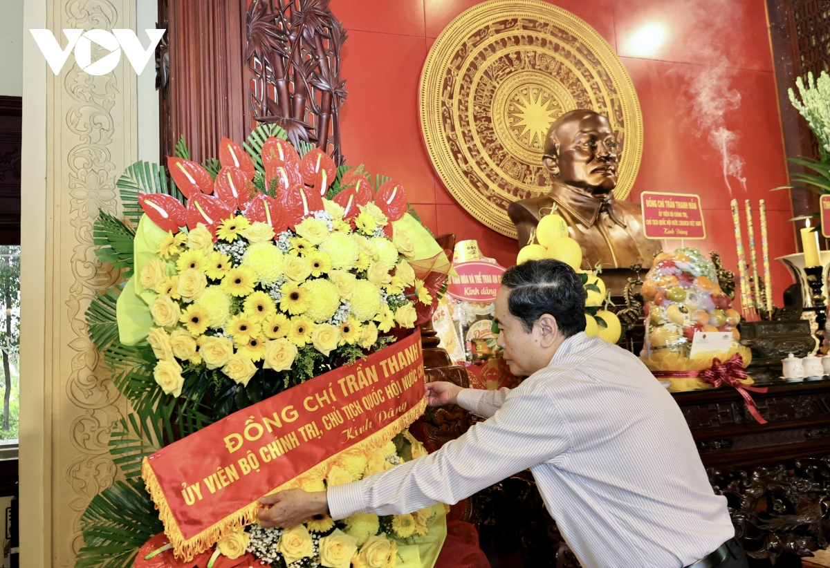 Chủ tịch Quốc hội Trần Thanh Mẫn dâng hoa tưởng nhớ Chủ tịch Tôn Đức Thắng. Ảnh: Lê Tuyết/VOV |