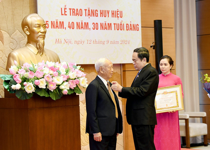 (VOV5) - Nhân dịp kỷ niệm 79 năm Cách mạng tháng 8 và Quốc khách 02/9 (2/9/1945-2/9/2024), chiều tối nay (12/9), tại Nhà Quốc hội (Hà Nội), Đảng ủy cơ quan Văn phòng Quốc hội trang trọng tổ chức Lễ trao tặng Huy hiệu 65 năm, 40 năm và 30 năm tuổi đảng cho các Đảng viên trong Đảng bộ cơ quan. Bí thư Đảng đoàn Quốc hội, Chủ tịch Quốc hội Trần Thanh Mẫn dự Lễ trao tặng.