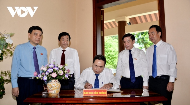 Chủ tịch Quốc hội Trần Thanh Mẫn ghi sổ lưu niệm tại Khu Lưu niệm Chủ tịch Hội đồng Bộ trưởng Phạm Hùng.. Ảnh: VOV |