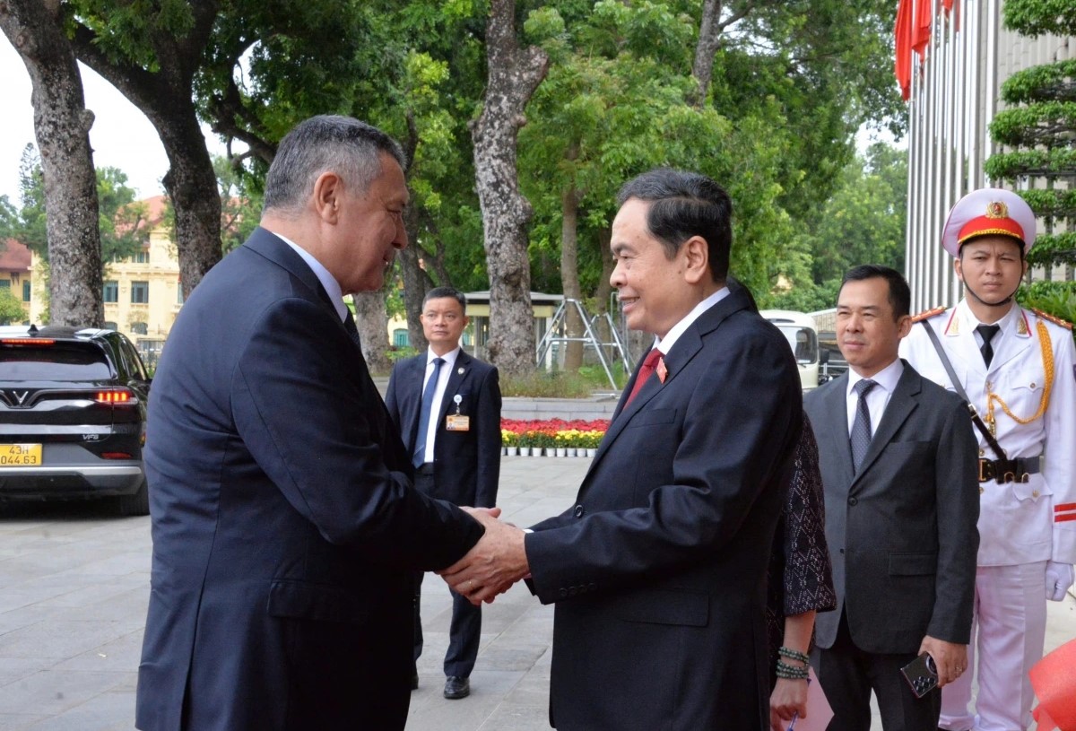 Chủ tịch Quốc hội Trần Thanh Mẫn đón Chủ tịch Hạ viện Uzbekistan Nuriddin Ismoilov. Ảnh: Lê Tuyết/VOV |