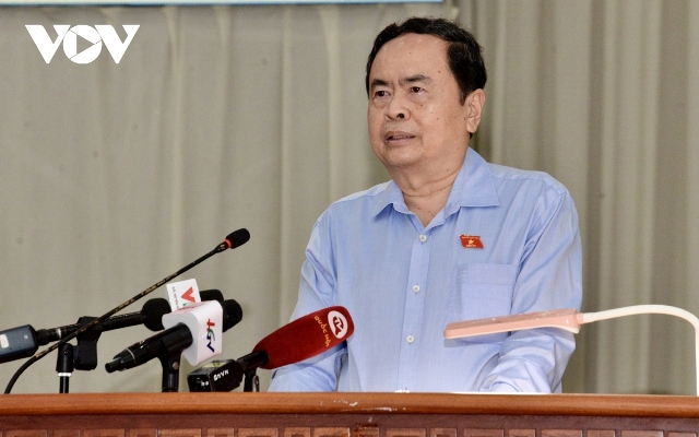 Chủ tịch Quốc hội Trần Thanh Mẫn phát biểu tại cuộc tiếp xúc cử tri. Ảnh: Lê Tuyết/VOV |
