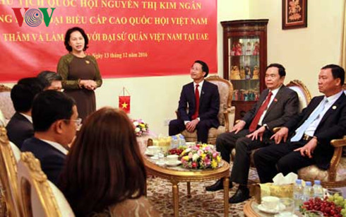 Trước đó, tối 13/12 (theo giờ địa phương), Chủ tịch Quốc hội Nguyễn Thị Kim Ngân gặp gỡ cán bộ đại sứ quán và đại diện cộng đồng người Việt Nam tại Các Tiểu vương quốc Ả Rập Thống nhất (UEA).