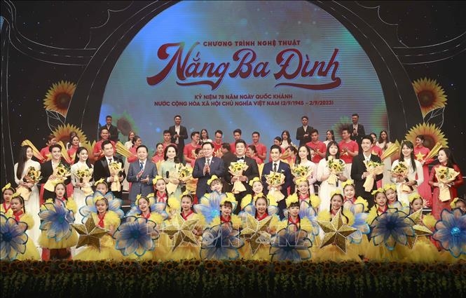 Chủ tịch Quốc hội Vương Đình Huệ tặng hoa các nghệ sĩ biểu diễn tại Chương trình nghệ thuật “Nắng Ba Đình”. Ảnh: Doãn Tấn - TTXVN |