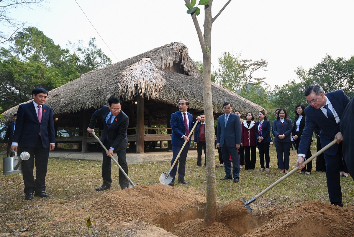 Chủ tịch Quốc hội, lãnh đạo Văn phòng Quốc hội, lãnh đạo tỉnh tham gia trồng cây lưu niệm tại đình Tân Trào. Ảnh: Lê Tuyết/VOV |