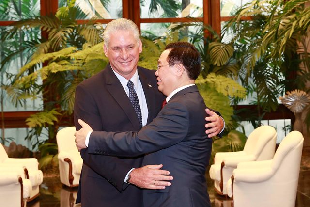 Chủ tịch Quốc hội Vương Đình Huệ Bí và thư thứ nhất, Chủ tịch Cuba Miguel Díaz-Canel. Ảnh: quochoi.vn |