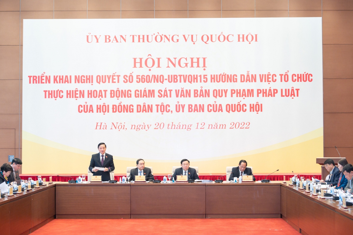 Sáng 20/12, tại Nhà Quốc hội, Ủy ban Thường vụ Quốc hội đã tổ chức Hội nghị triển khai Nghị quyết hướng dẫn việc tổ chức thực hiện hoạt động giám sát văn bản quy phạm pháp luật của Hội đồng dân tộc, Ủy ban của Quốc hội (Nghị quyết 560).