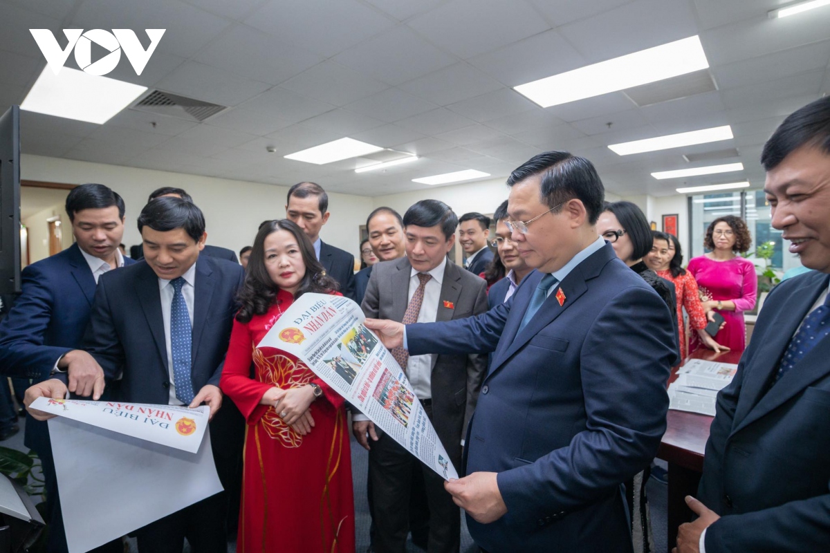 Chủ tịch Quốc hội Vương Đình Huệ thăm và chúc Tết cán bộ, phóng viên Báo Đại biểu Nhân dân. Ảnh: Lê Tuyết/VOV |