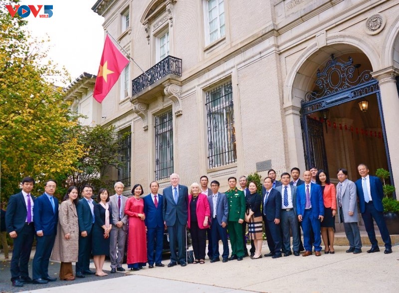 Thượng nghị sỹ Patrick Leahy và phu nhân cùng toàn thể cán bộ Đại sứ quán Việt Nam tại Hoa Kỳ trước Nhà Việt Nam ở thủ đô Washington. Ảnh: PV VOV tại Mỹ |
