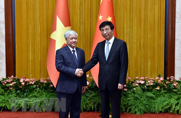 Chủ tịch MTTQ Việt Nam Đỗ Văn Chiến gặp Chủ tịch Chính Hiệp Trung Quốc Vương Hộ Ninh trong chuyến thăm tới Trung Quốc vào tháng 7/2023. Ảnh: Thanh Dương/TTXVN |
