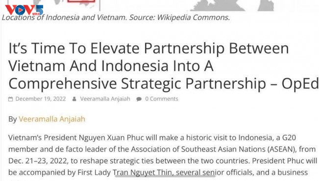 “Đã đến lúc nâng tầm quan hệ đối tác Việt Nam – Indonesia lên Đối tác Chiến lược Toàn diện” là bài viết của học giả Indonesia Veeramalla Anjaiah, Trung tâm nghiên cứu Đông Nam Á, đăng trên tờ Eurasia Review.