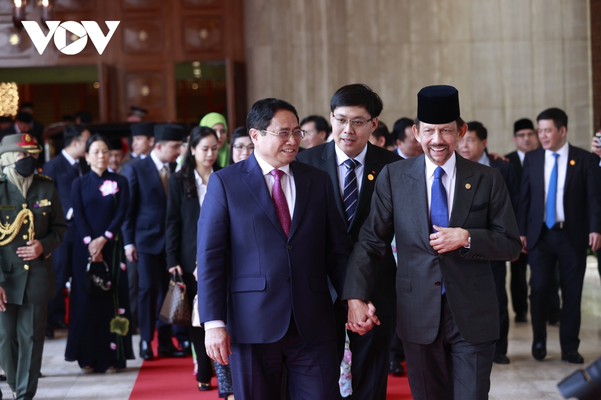 Quốc vương Hassanal Bolkiah nồng nhiệt chào mừng Thủ tướng Phạm Minh Chính. Ảnh: VOV |