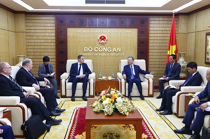 Ngày 23/02, tại Hà Nội, Đại tướng Tô Lâm, Bộ trưởng Bộ Công an tiếp ông Samuel Fringant, Chủ tịch Tập đoàn Tư vấn công nghiệp quốc phòng Pháp (Tập đoàn DCI) đang có chuyến thăm và làm việc tại Việt Nam.