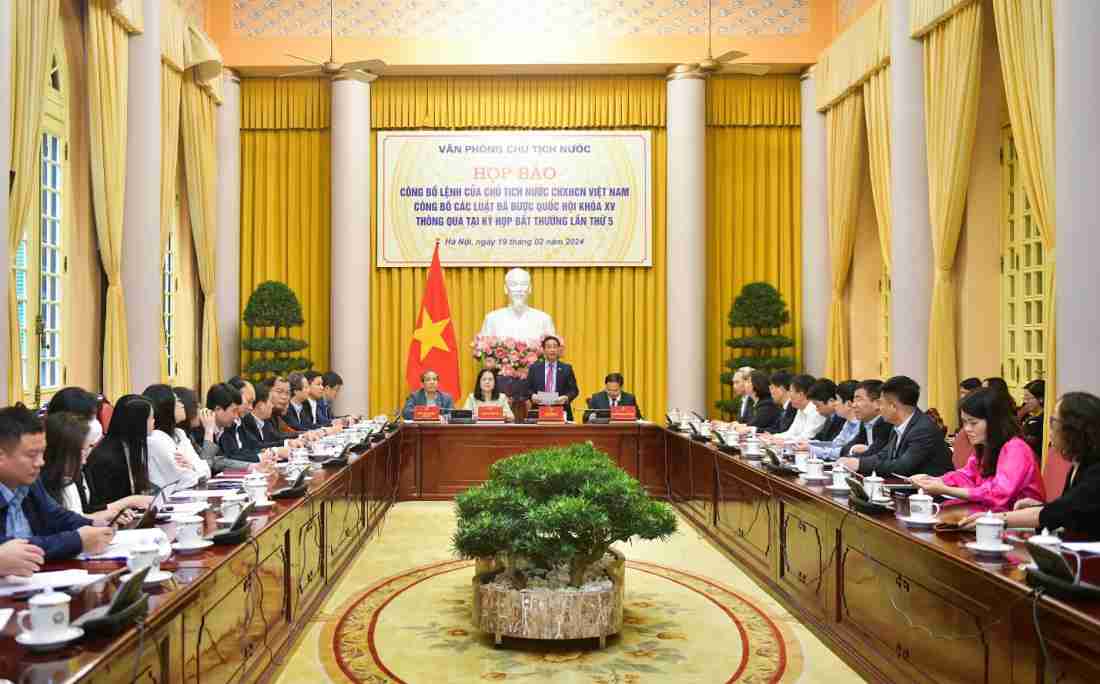 Sáng nay (19/2), tại Hà Nội, Văn phòng Chủ tịch nước tổ chức họp báo công bố Lệnh của Chủ tịch nước công bố các luật được Quốc hội khóa XV thông qua tại Kỳ họp bất thường lần thứ năm, bao gồm: Luật Đất đai (sửa đổi); Luật Các tổ chức tín dụng (sửa đổi).