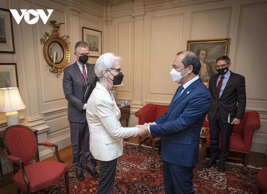 Nhân dịp này, hai bên trao đổi về các ưu tiên trong năm 2022 nhằm thúc đẩy hơn nữa quan hệ Đối tác toàn diện Việt Nam-Hoa Kỳ, trong đó nhấn mạnh tầm quan trọng của việc trao đổi đoàn các cấp. Thứ trưởng Sherman đánh giá cao sự chủ động, tích cực của Việt Nam trong ASEAN, tỏ mong muốn nâng quan hệ ASEAN - Hoa Kỳ lên một tầm cao mới. Hai bên cũng trao đổi về các vấn đề quốc tế và khu vực cùng quan tâm.
