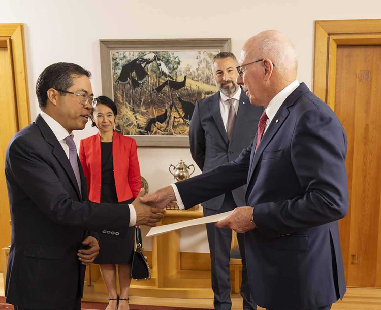 Đại sứ Phạm Hùng Tâm trình Thư ủy nhiệm lên Toàn quyền Australia David Hurley. Ảnh: ttdn.vn |