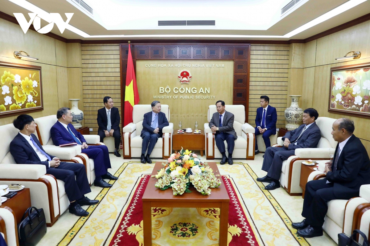 Bộ trưởng Bộ Công an Tô Lâm tiếp Thứ trưởng Bộ Công an Lào. Ảnh: VOV |
