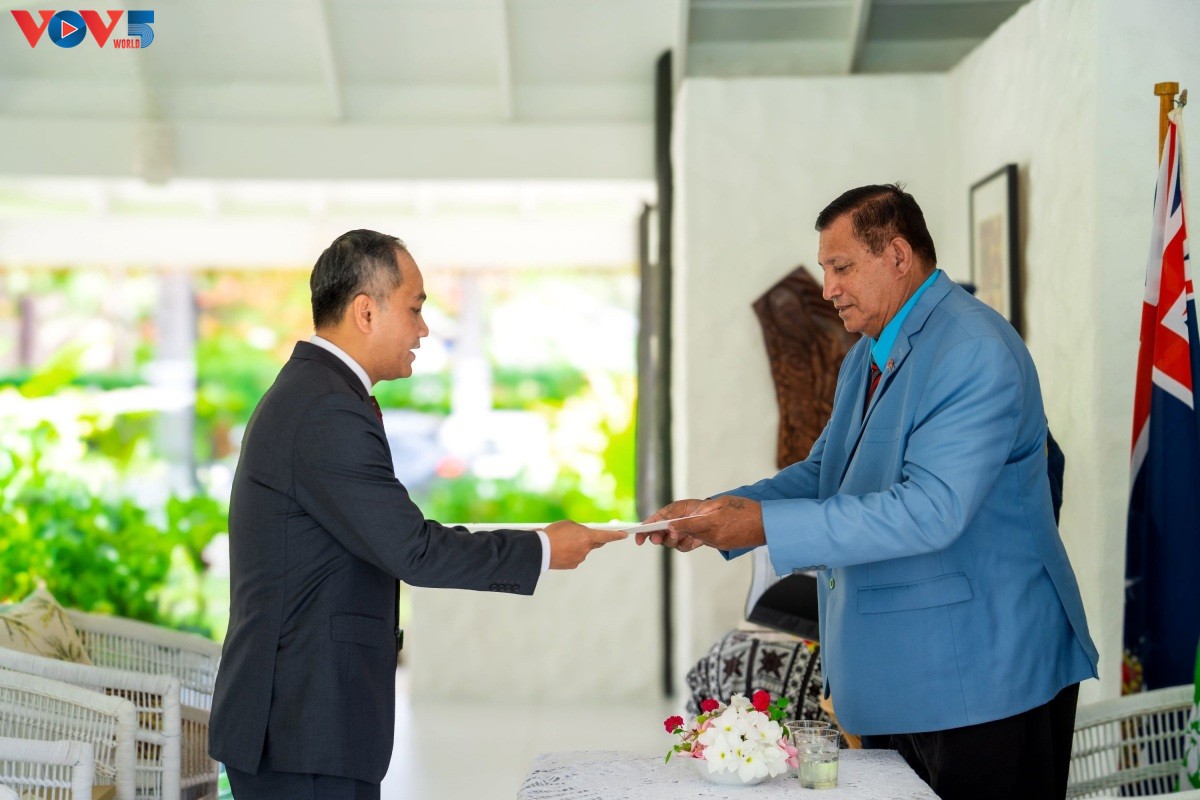Đại sứ Phan Minh Giang trình Thư ủy nhiệm lên Ngài Tom Marsters, Đại diện Nhà vua Anh Charles III tại Quần đảo Cook. Ảnh: VOV |
