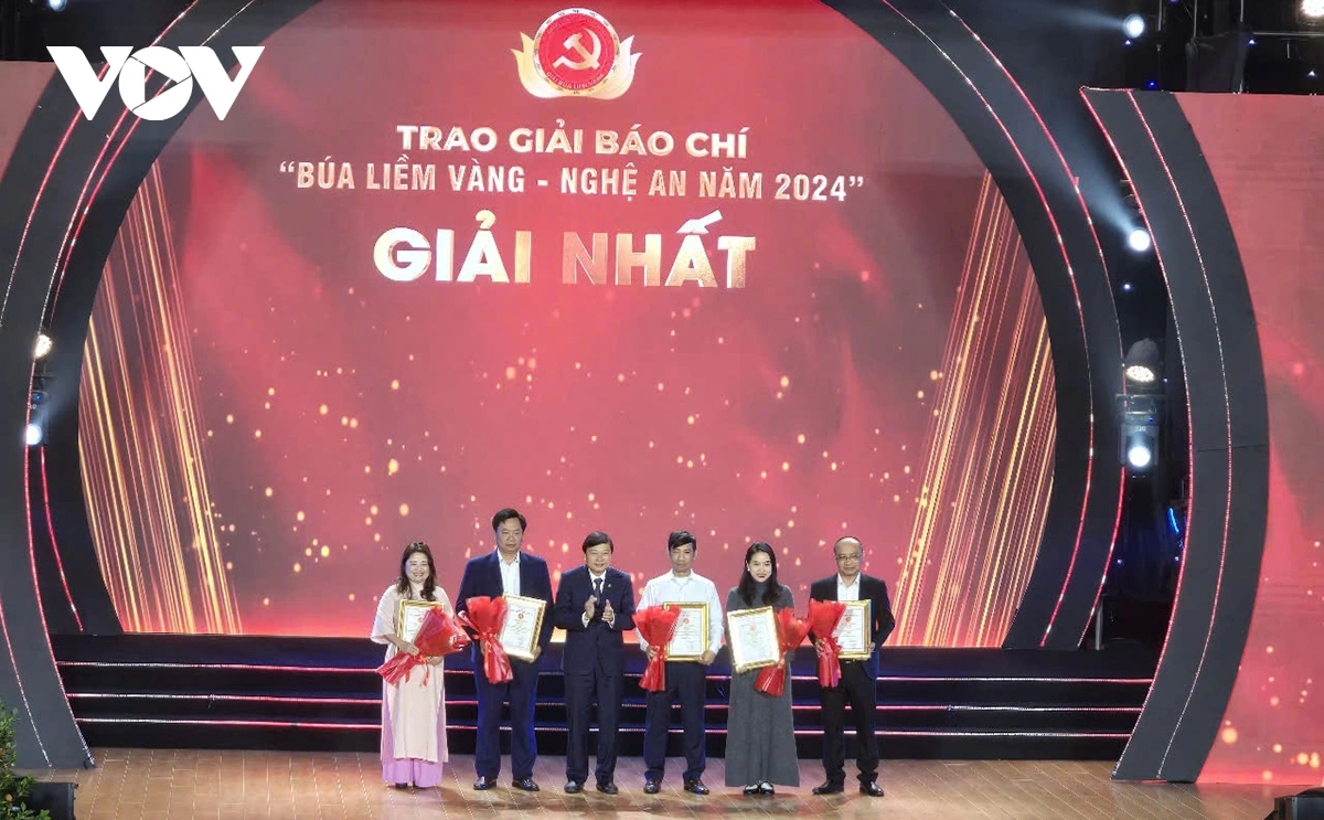 Phóng viên Sỹ Đức - Ban Thời sự, Đài TNVN (ngoài cùng bên phải) đoạt giải A - Giải báo chí Búa Liềm vàng Nghệ An 2024. Ảnh: VOV1 |