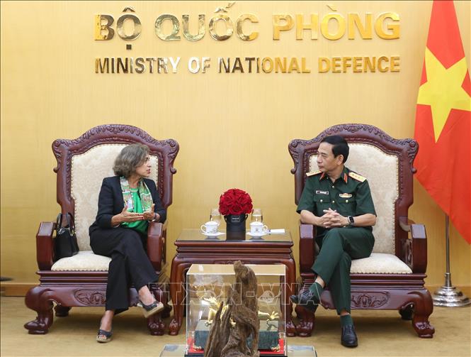Đại tướng Phan Văn Giang tiếp bà Carmen Cano DeLasala, Đại sứ Đặc mệnh toàn quyền Vương quốc Tây Ban Nha tại Việt Nam. Ảnh: TTXVN |