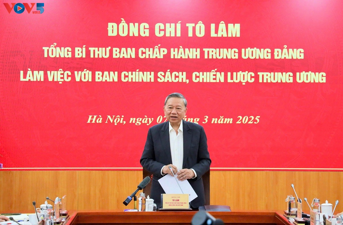 Tổng Bí thư Tô Lâm chủ trì buổi làm việc với Ban Chính sách và Chiến lược Trung ương tại Hà Nội, chiều 7/3 - Ảnh: VOV |